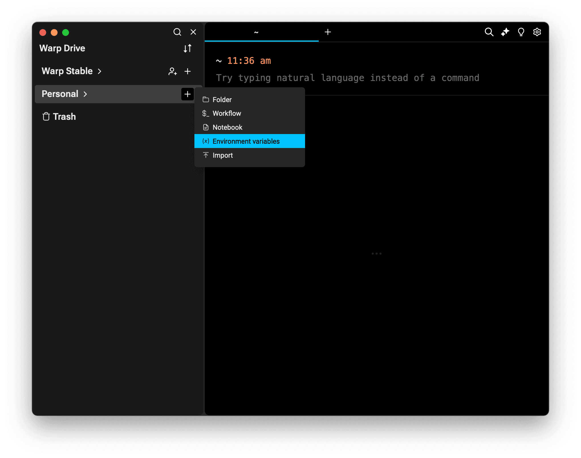 Next, open your Warp Drive and create a new set of environment variables, just like you’d add a new workflow or notebook.