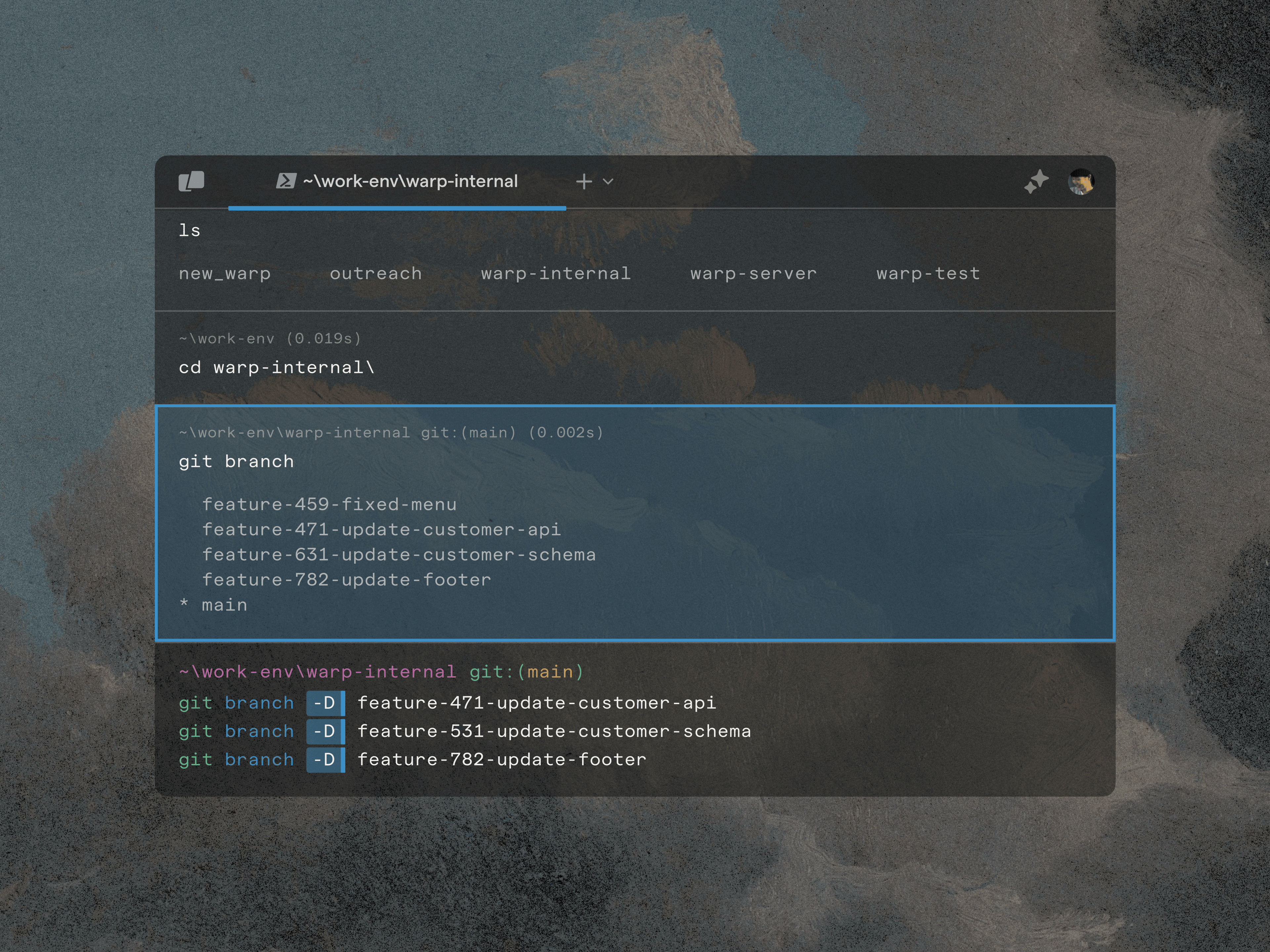 Use natural language to navigate your terminal with Agent Mode: debug errors, fix code, summarize logs, and more. Warp AI goes beyond just answering questions – it anticipates your next move.