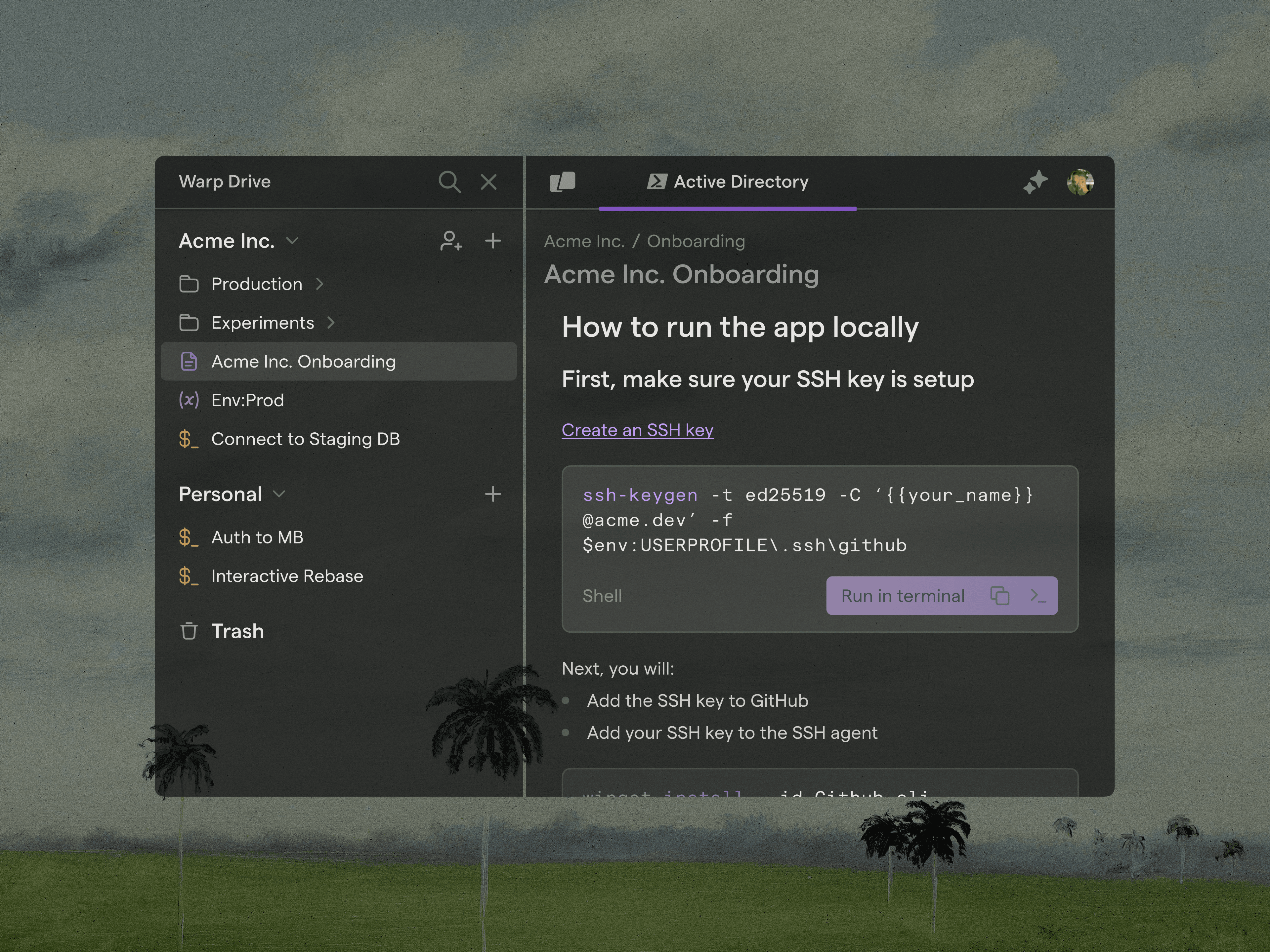 Warp Drive allows you to save your most-run commands in Workflows or Notebooks, which can be shared with teammates via link. Imagine onboarding a teammate by sending your most-run commands, or creating a tutorial for using your CLI.