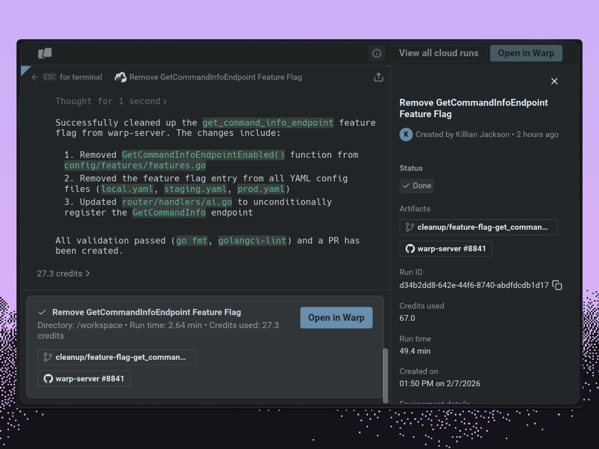 This will launch your agent into the cloud on Warp’s hosted infrastructure. We also have a self-hosted option for enterprises.