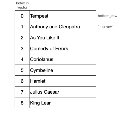 Warp’s grid is a circular buffer that stores rows sequentially in a vector. Say, for example, you create a grid storing a subset of Shakespeare plays that are sorted alphabetically. How this renders on screen and how this is stored internally might look something like this: