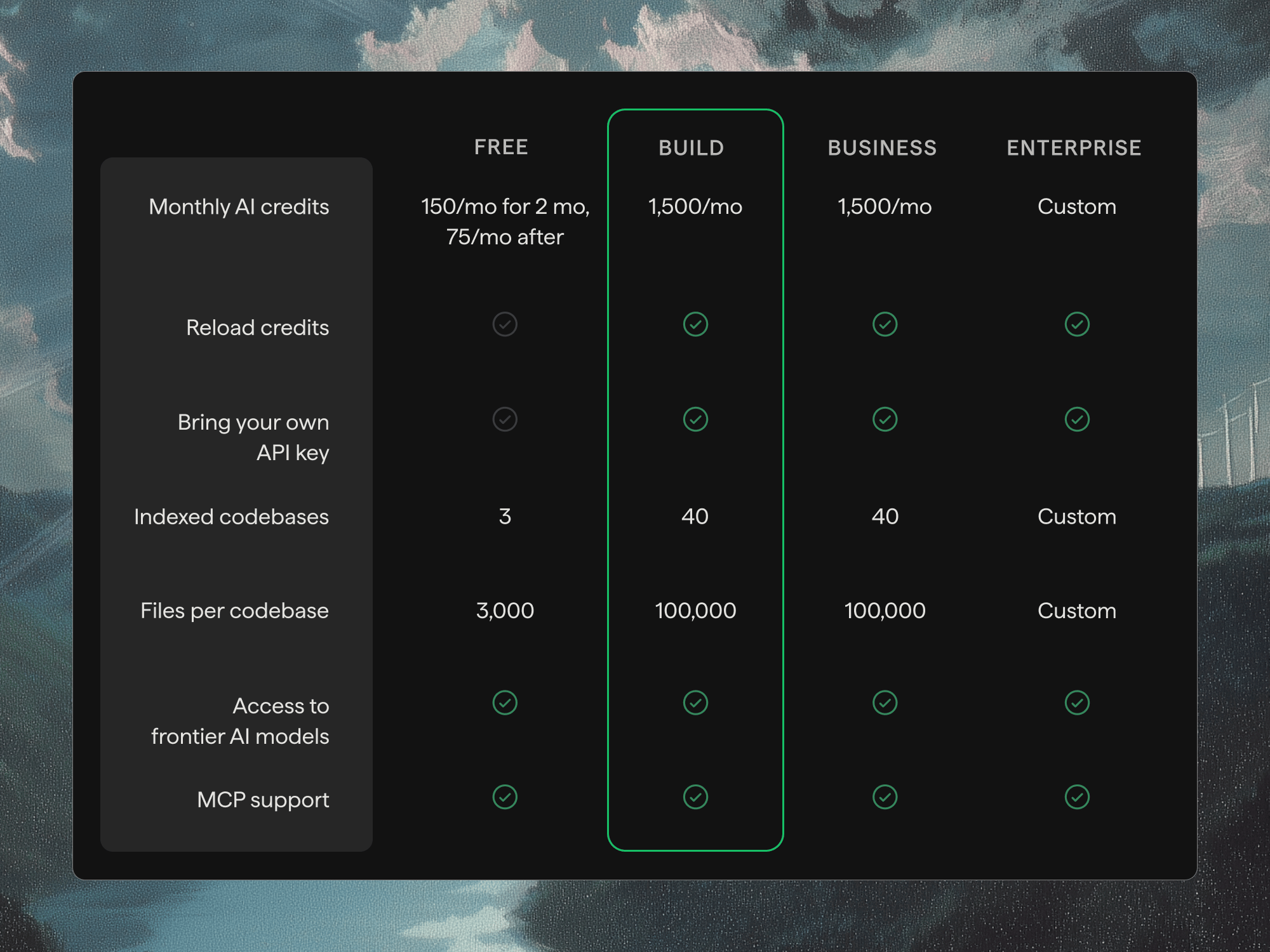 • Highest codebase indexing limits (up to 40 repositories with 100,000 files each)