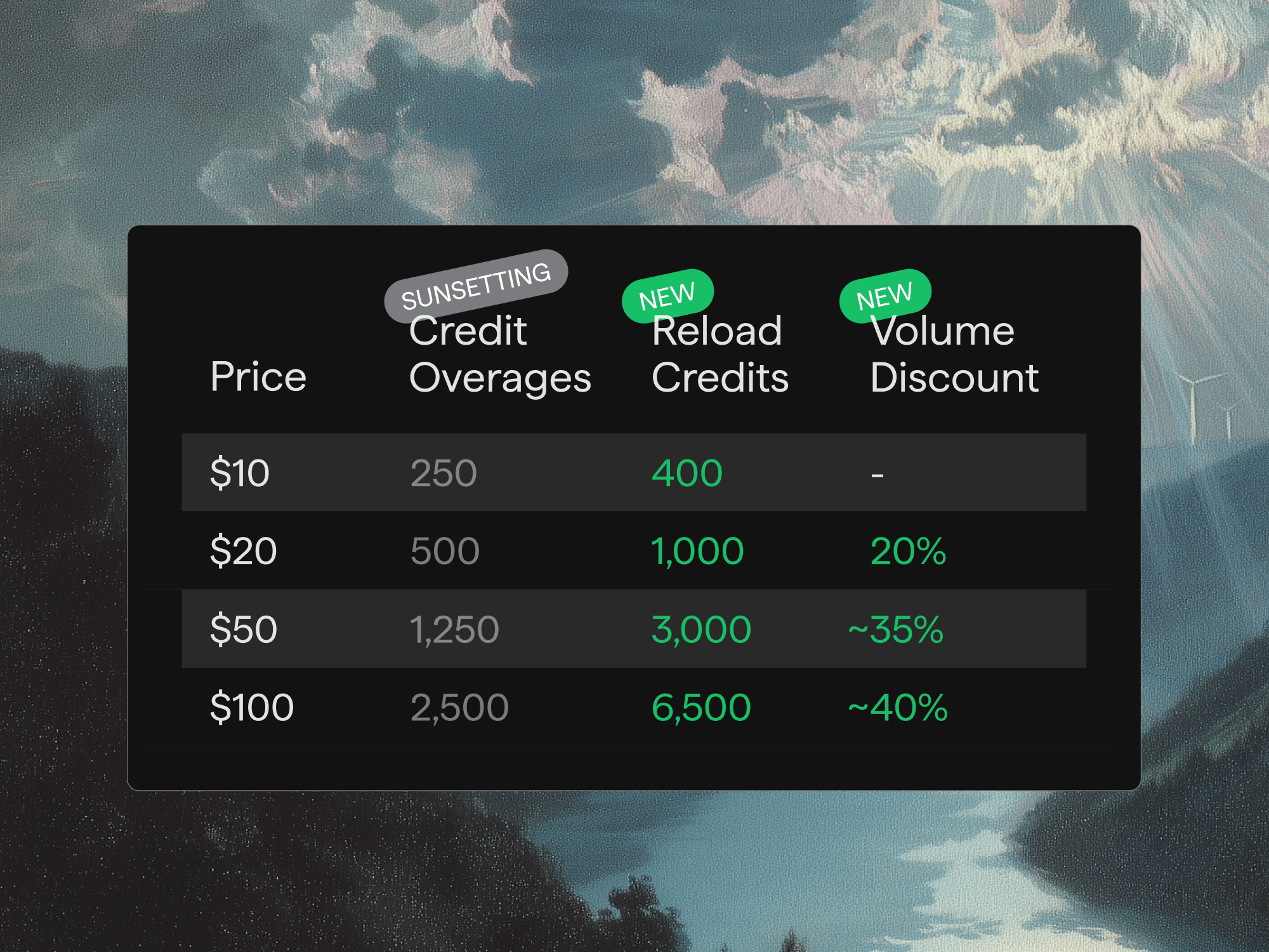 Reload Credits replace overages with a simpler, prepaid system. They’re up to 50% cheaper than the old overage rates, roll over month to month, and remain valid for 12 months.