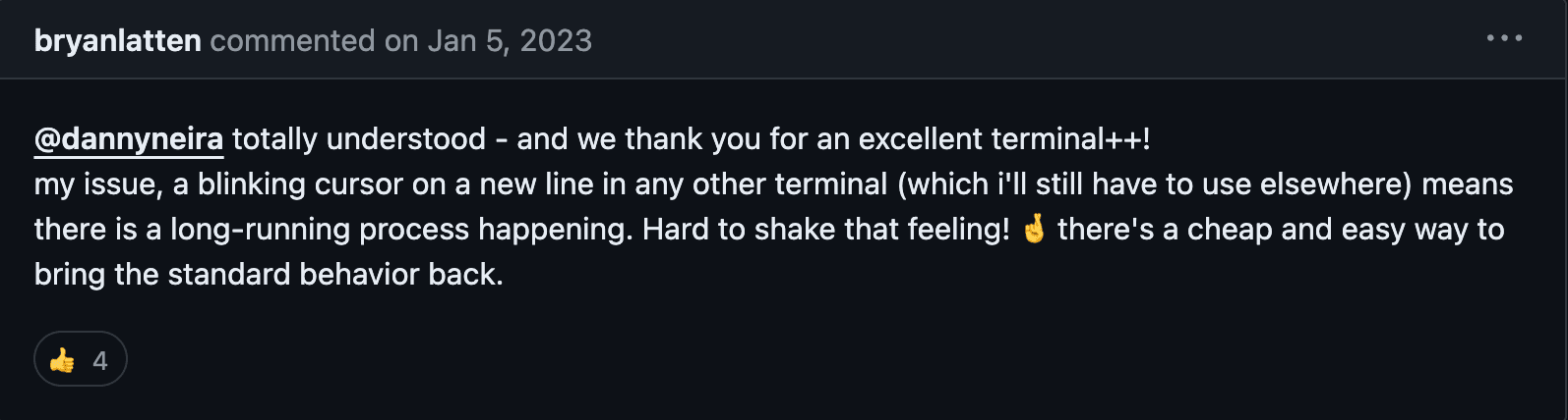 The most common reason for requesting the Same Line Prompt was to have a familiar experience. Some developers shared that the new line prompt was too confusing and it caused them to switch back to iTerm2.