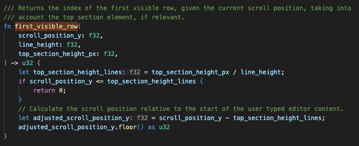 Additionally, to optimize performance within Warp, we also don’t render lines of text that are calculated to be “off-screen.” Hence, we need to update the logic that detects the “first visible line of text” in the Input Editor to account for this new scrolling behavior.