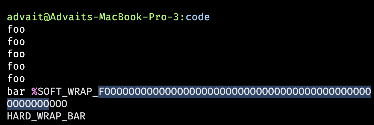 You may notice that even though we’ve separated out the prompt into two grids, the last line of our prompt still overlaps with the input editor component. In our code, we are having the input editor component now include this truncated prompt grid as part of the component, in what we’re calling the “left notch.” Notably, introducing this left notch into the input editor component leads to a lot of downstream effects in scrolling, text selection, and soft wrapping that we’ll talk about next.