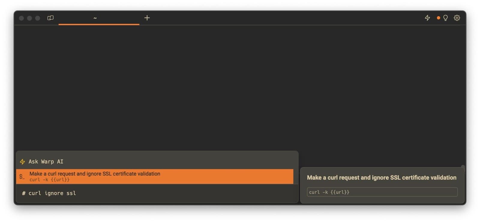 If you are using Warp, you can get to this request using the AI Command Search by typing # and then curl ignore ssl