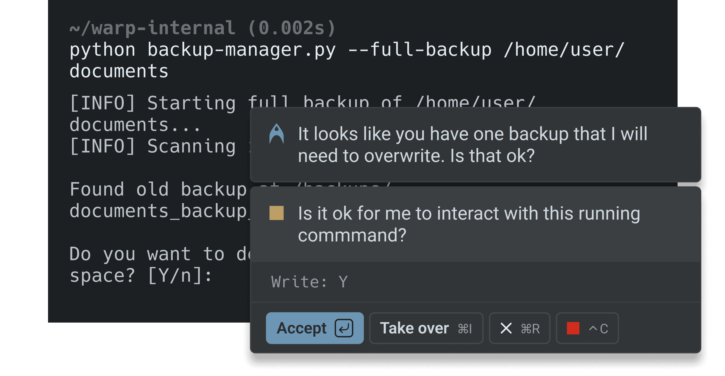 Warp Agent can run, monitor, and manage long-running commands like gdb, REPLs, and your server logs. You can also use Warp Agent in your SSH environments.