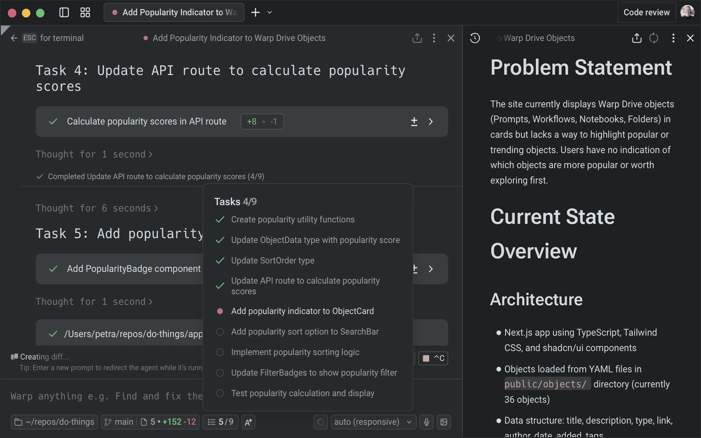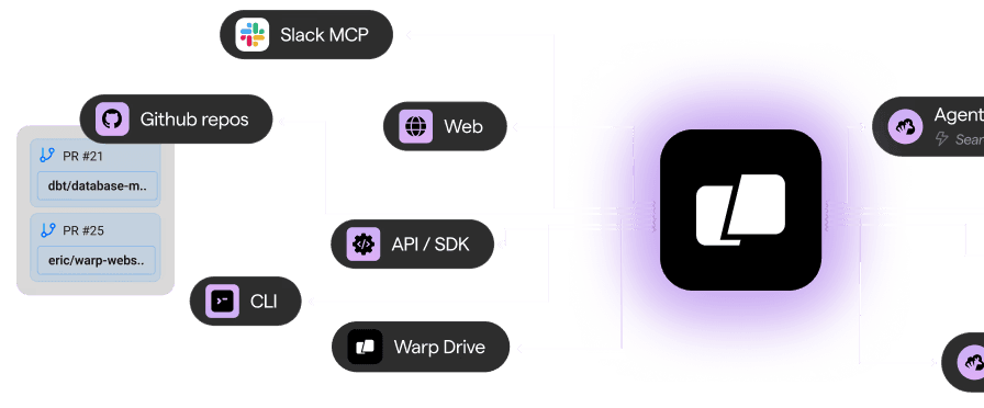 Warp Agent indexes your codebase in real time, pulls context from your Warp Drive, Skills, and docs, and makes changes across multiple repos.