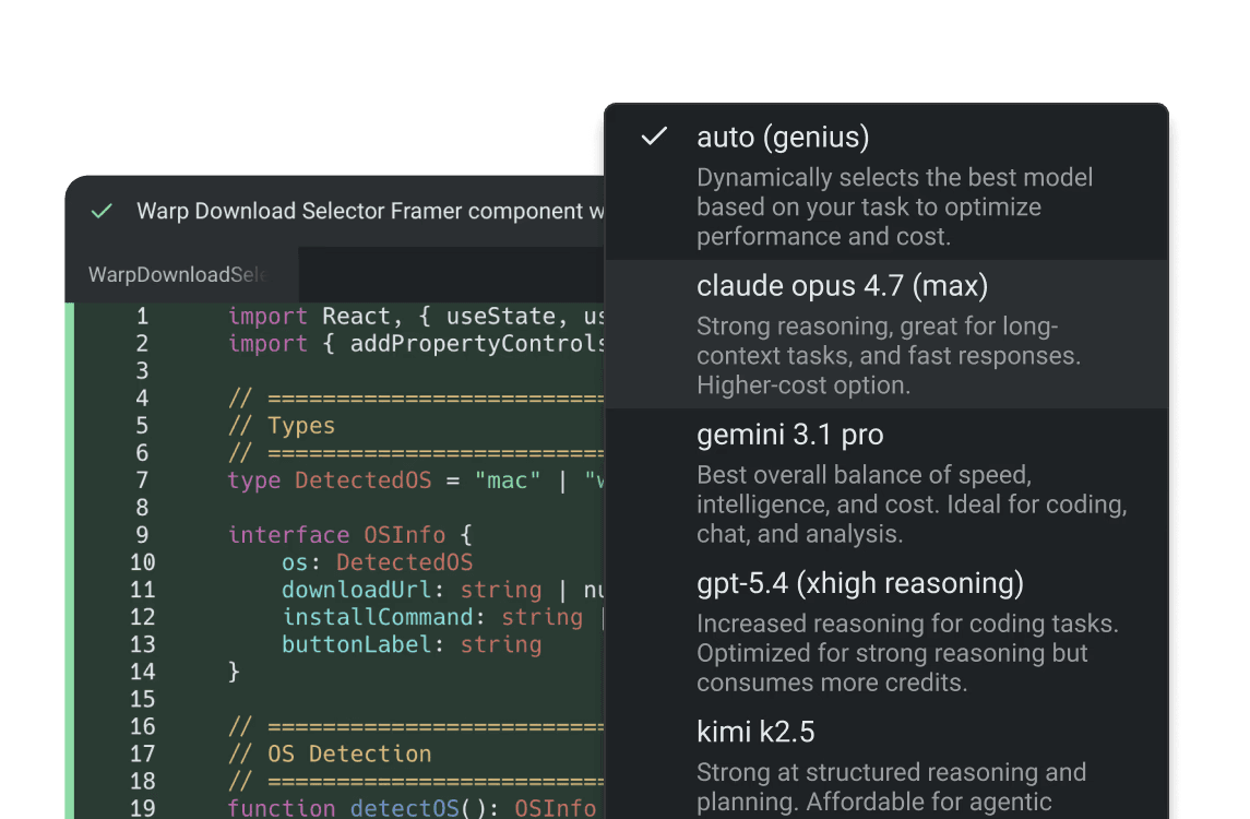 With Warp Agent, you have access to the latest models from OpenAl, Anthropic, and Google ensuring you can seamlessly switch between state-of-the-art models with 100% uptime.