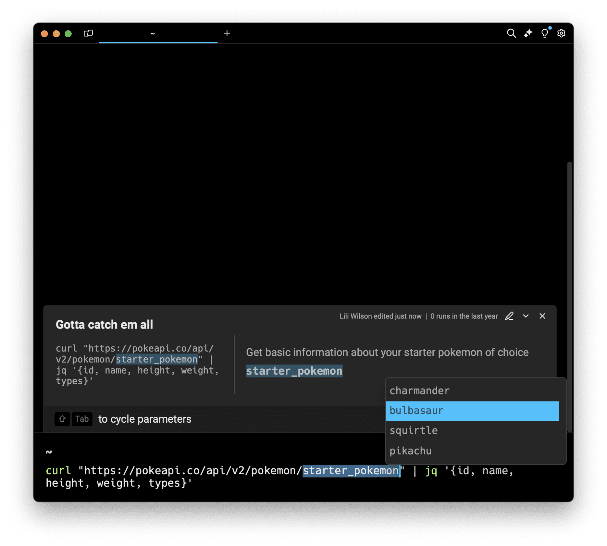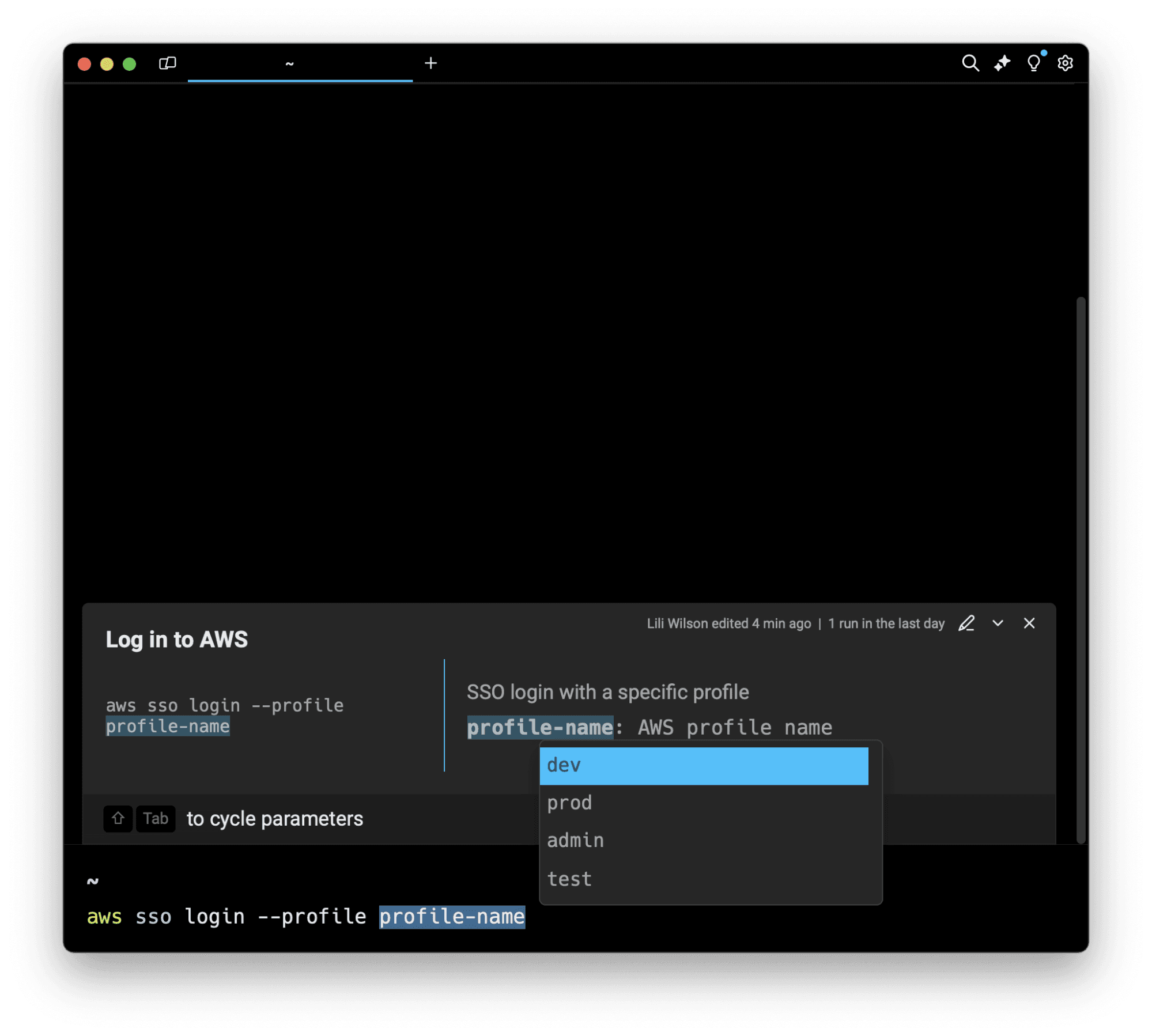 Now you can preset a defined list of suggested options for an argument. When you’re ready to run the workflow and build out your command, you can use the arrow keys to navigate through the options list and select the appropriate preset to fill in.