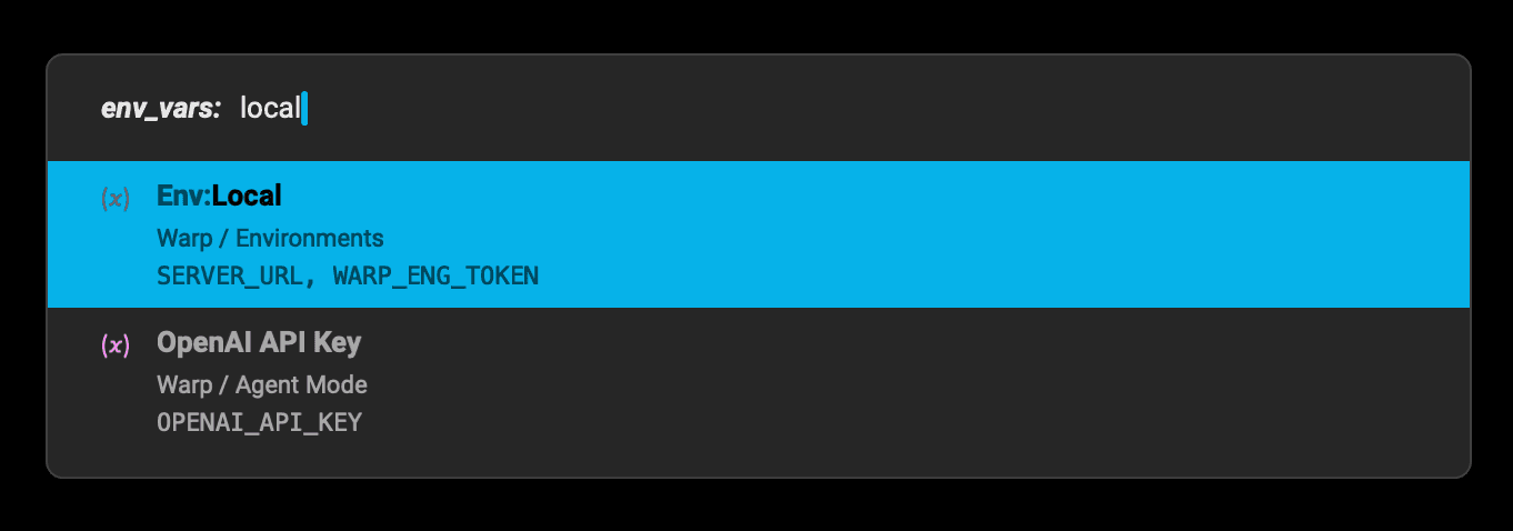 When you’re ready to use the environment variable in your session, you can search for it by name, either in Warp Drive or using the Command Palette. Both of these methods work in terminal sessions or in Warpified subshells.