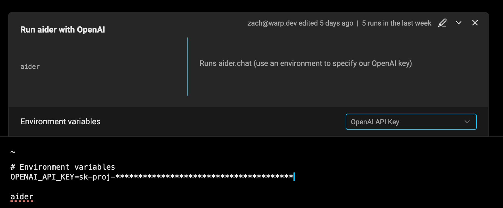 Workflows in Warp allow you to create parameterized commands you can run on-demand. Now, if you have environment variables saved, you will find the option to load those environment variables into your session along with any workflow.