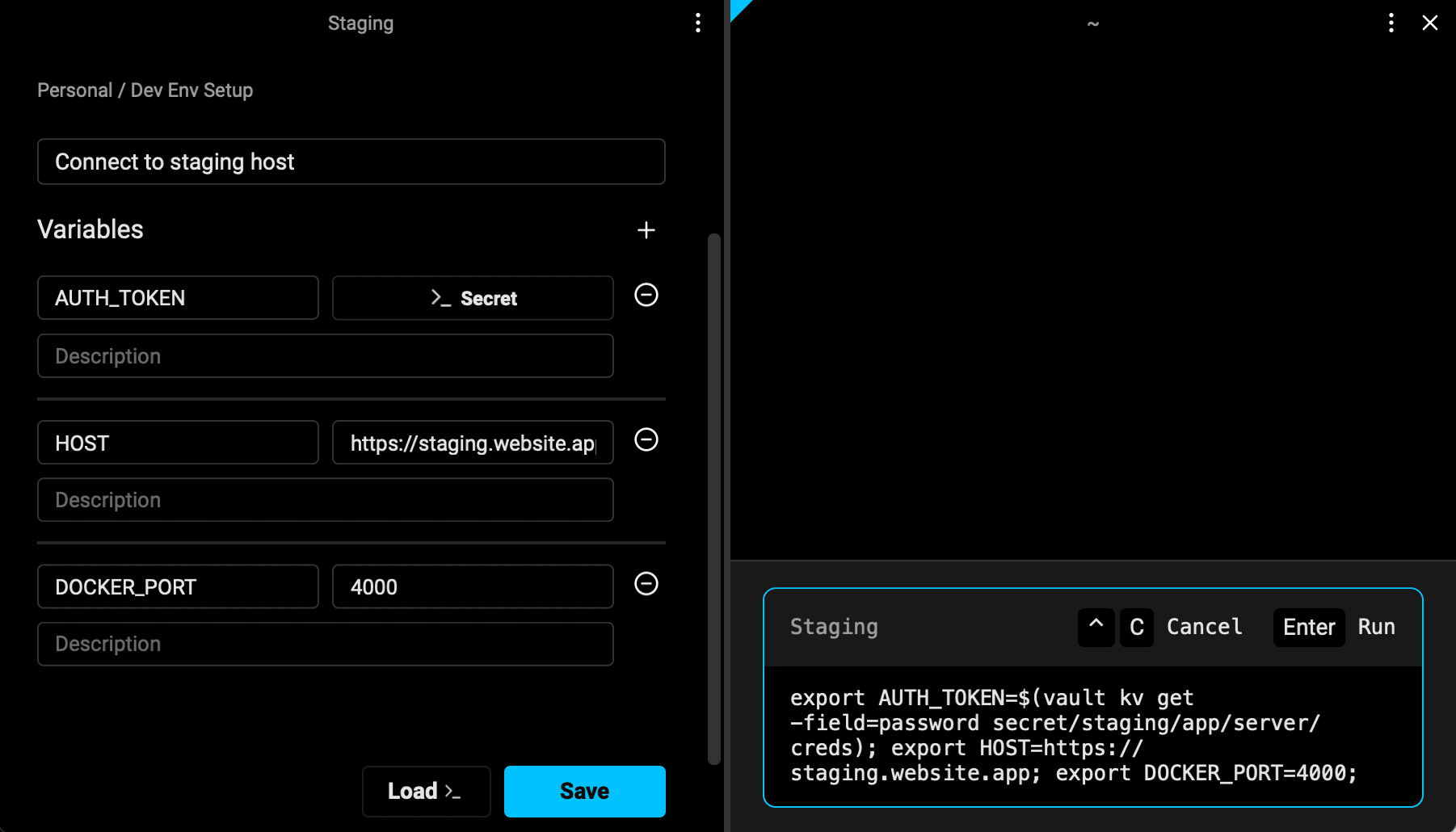 When you select a key, Warp will create a templated terminal command to pull that key into your terminal session at runtime, whenever you invoke the variables and load them into your session.