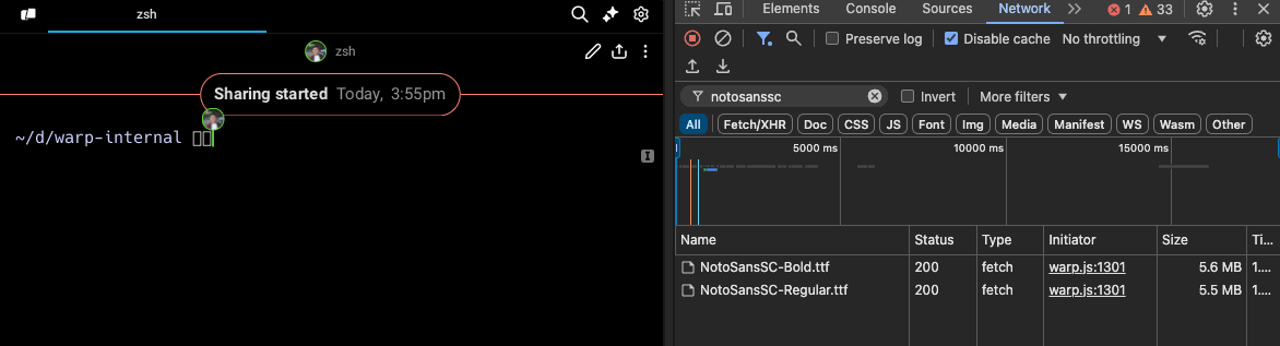 Sharing a session in Warp on the web, with 3 different fallback fonts in use: Noto Sans SC, Noto Color Emoji, and Hack Nerd Font!