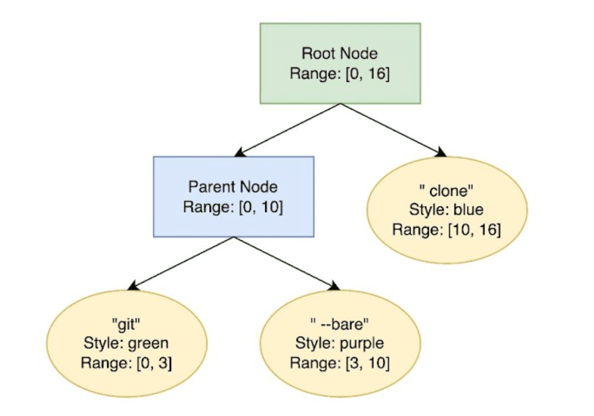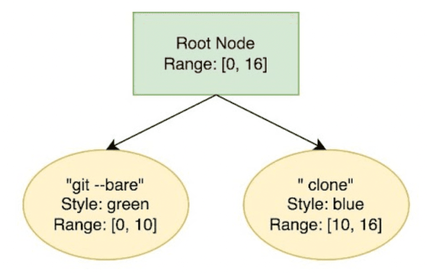 Let’s take a look at what the "git --bare clone" example would look like within SumTrees (note that we’re glossing over some of the complexity of the data structure for illustrative purposes e.g. keeping track of when text is inserted/deleted). Specifically, let’s try representing the last 3 lines from the example above in a SumTree. First, we start off with 2 child nodes representing parts of different styles: