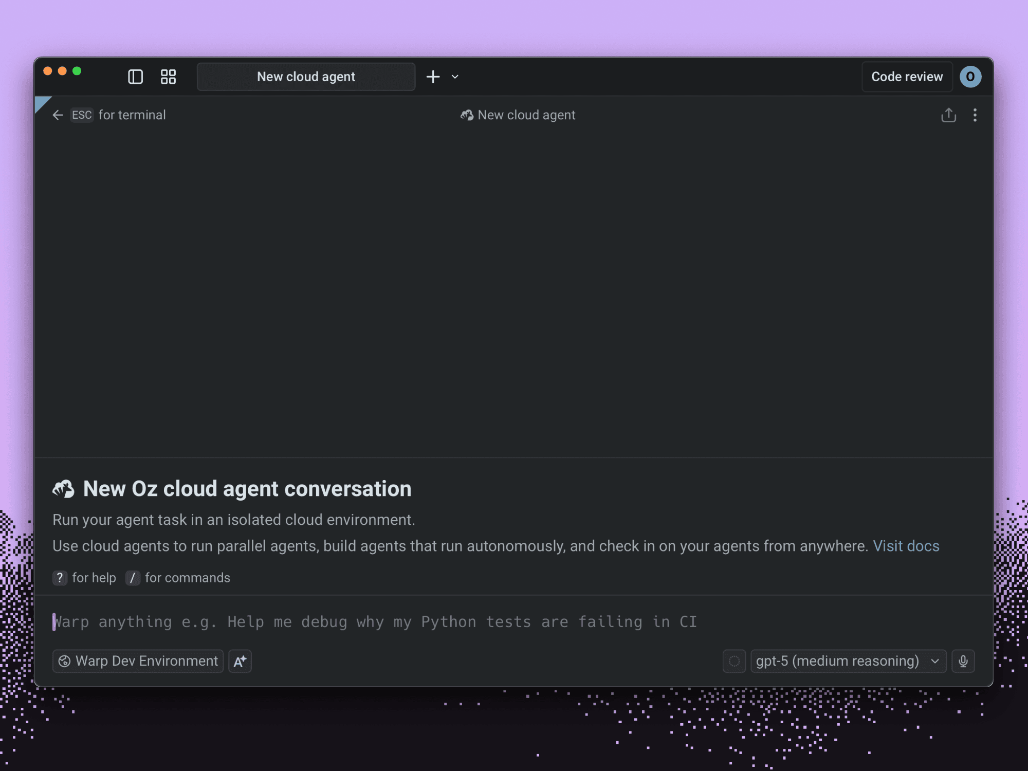 This will launch your agent into the cloud on Warp’s hosted infrastructure. We also have a self-hosted option for enterprises.