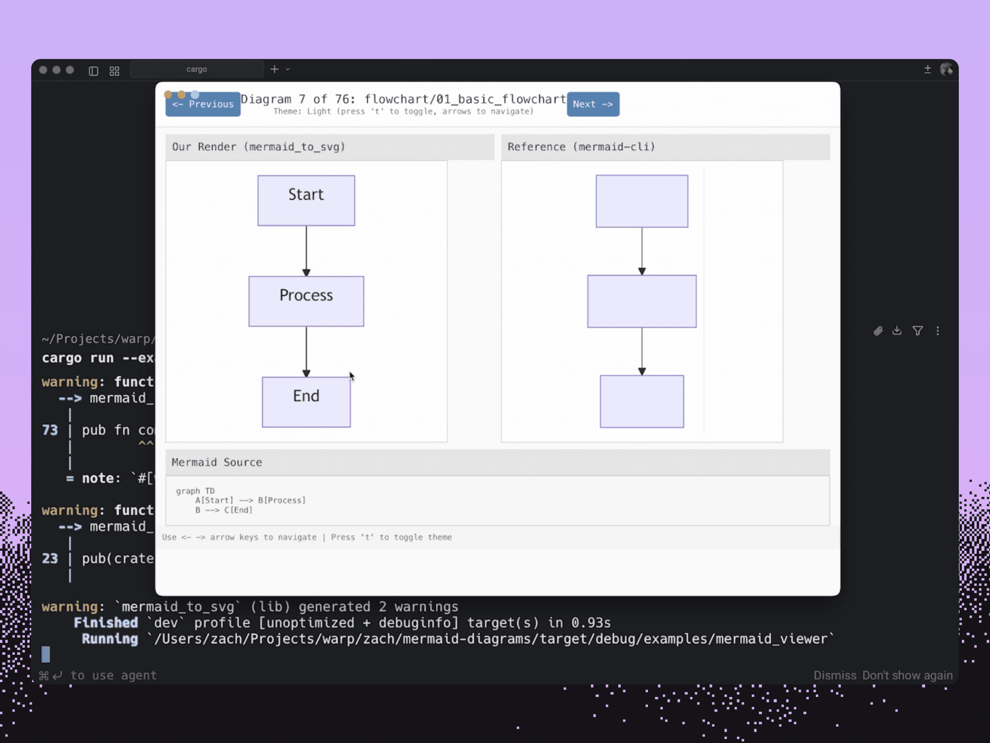 Warp is written with a custom Rust UI framework, which means we can’t leverage some common libraries like mermaid.js to do visualizations. I used Oz to parallelize the task of recreating the mermaid framework in rust, programmatically spinning up one agent per diagram type. Each Oz agent even used Computer Use to compare results to the canonical mermaid result.