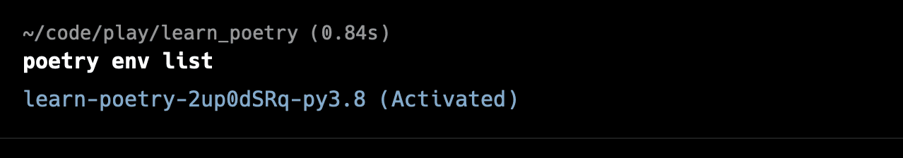 We can use poetry env list to find which environments poetry knows about, and which one is active.