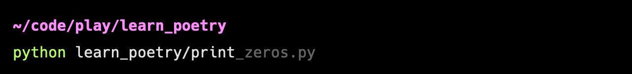 Let’s try that out. As an example, we’ll first create a simple demo script in learn_poetry/print_zeros.py. It uses a dependency of this project, numpy.