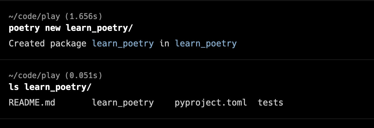 To create a new Python project, use the poetry new command. This generates a new Python project with good defaults. Here’s an example: