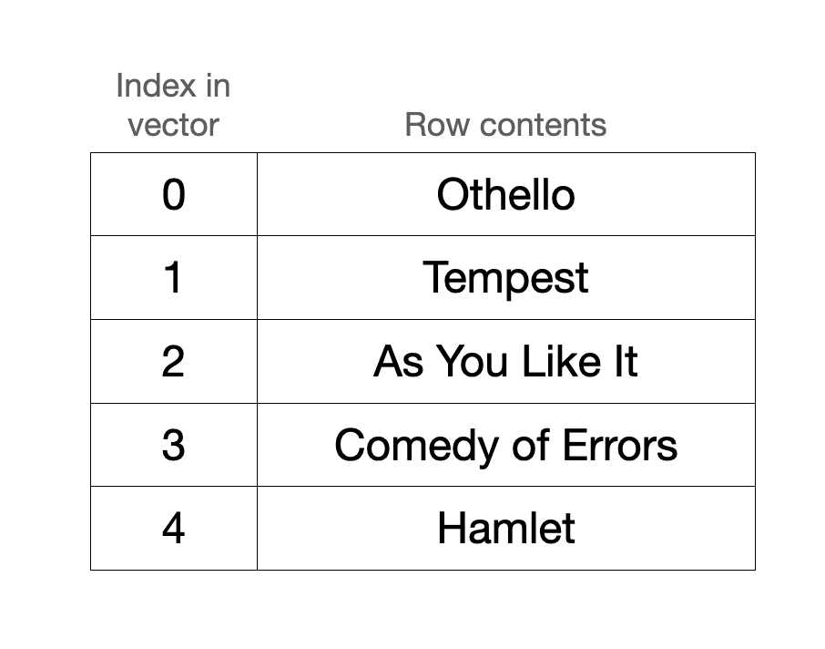 Warp’s grid is a circular buffer that stores rows sequentially in a vector. Say, for example, you create a grid storing a subset of Shakespeare plays that are sorted alphabetically. How this renders on screen and how this is stored internally might look something like this: