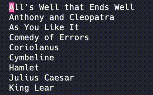 In Warp, scrolling in a command like vim, emacs, git log, git diff, or many others is optimized to avoid the ultimate price in the grid world – having to move physical memory. Inspired from the previous section, imagine an example of scrolling the contents of the Shakespeare file upwards to reveal a new row at the bottom of the screen: