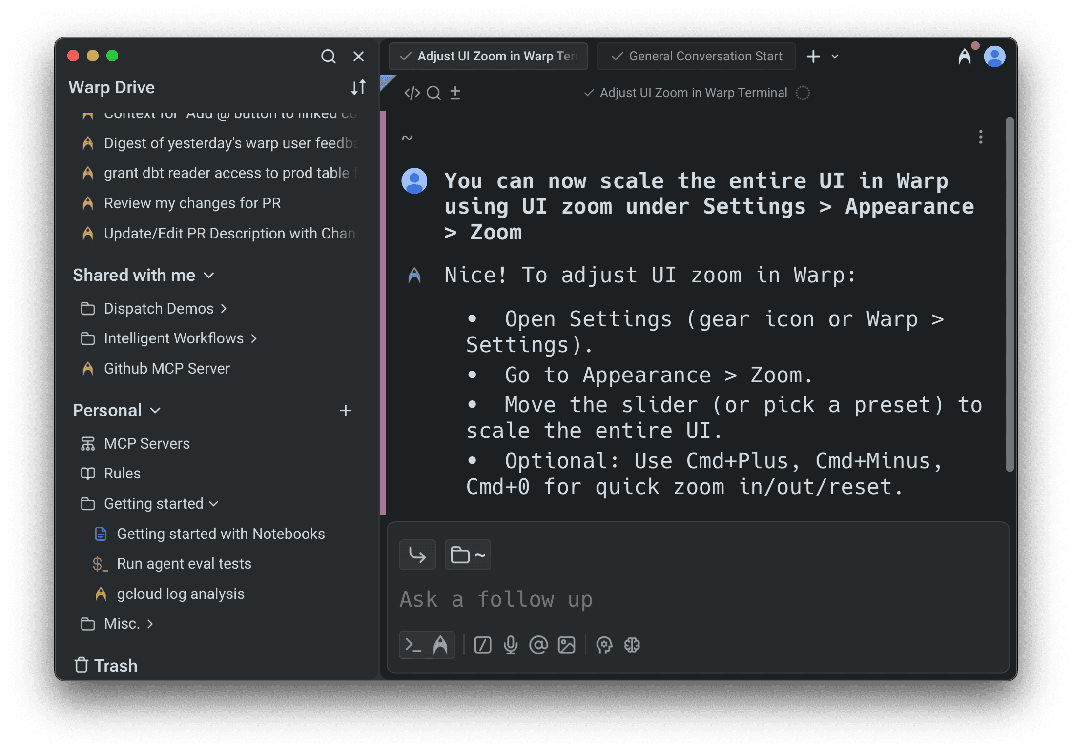 We just rolled out full UI zoom for Warp — finally! This has been one of the top five most-requested features since our early beta days. Until now, hitting CMD + on Mac (or CTRL + on Windows/Linux) only changed the terminal font size, leaving the rest of the interface the same. If you were on a high-DPI monitor or needed better accessibility, that meant the UI stayed stubbornly small.