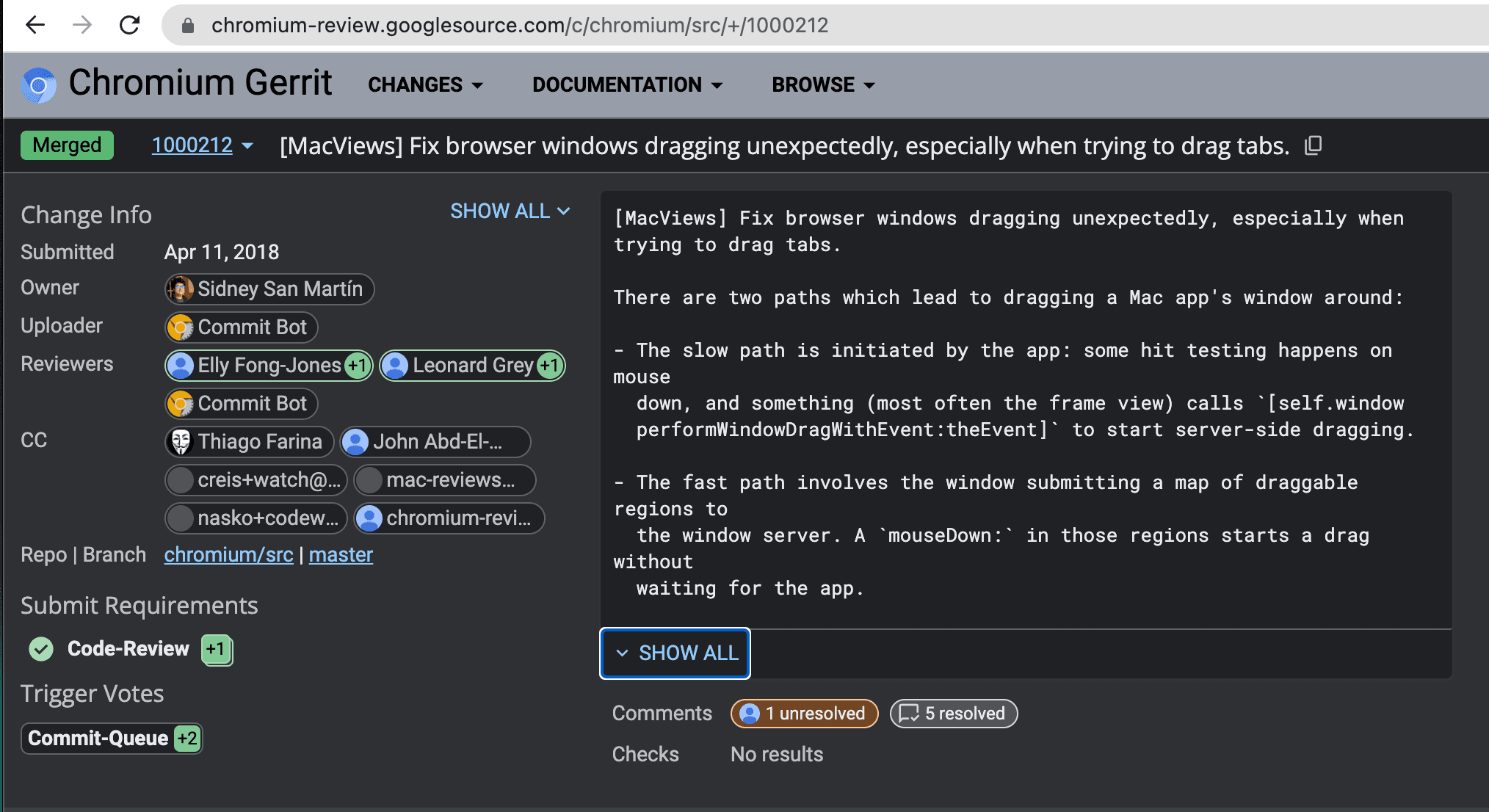 Next, I turned to Chromium, which was a much more daunting task since I didn’t really have a starting point. I spent many hours tracing through code search to find snippets of code that seemed to be related. Similar to Electron, every time I found something that looked possible, I would get excited and try it locally, only to be met time and again by the same persistent window dragging.