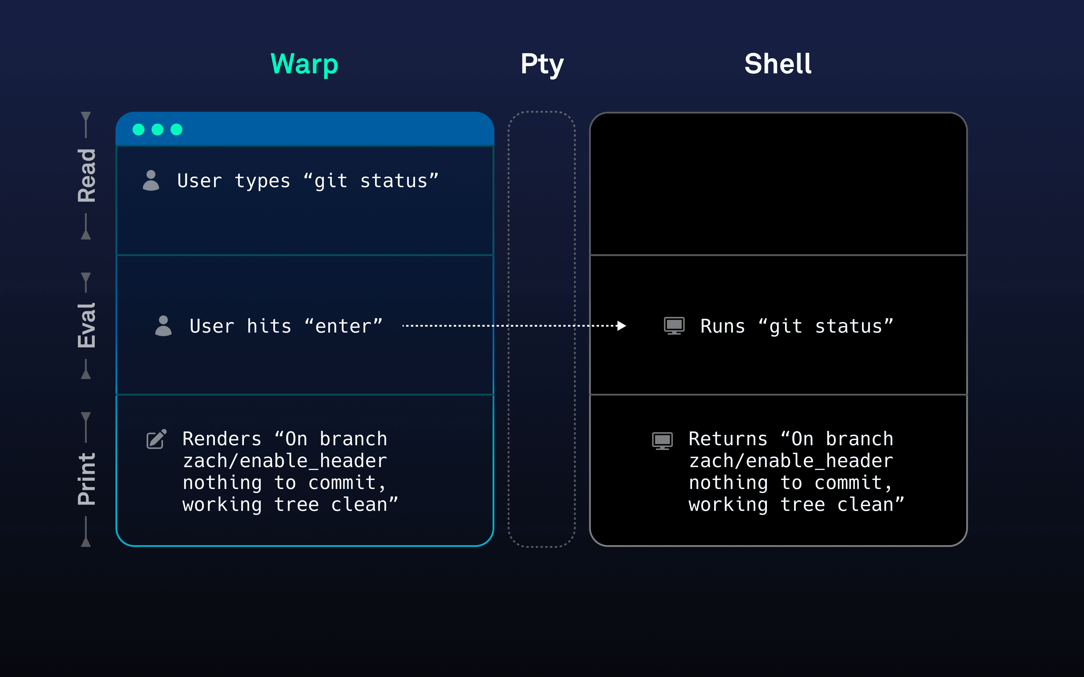 So instead of the traditional REPL model referenced above, in Warp the REPL works like: