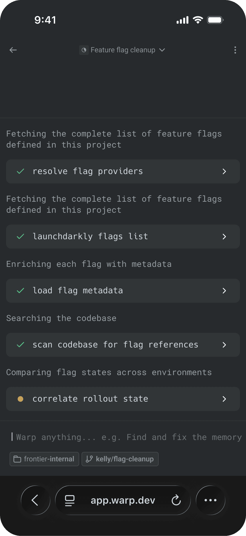 Start cloud agents from the Warp app, the web, or even your phone— and track them too. Join agent sessions with one click from the CLi, web, mobile, or Warp.