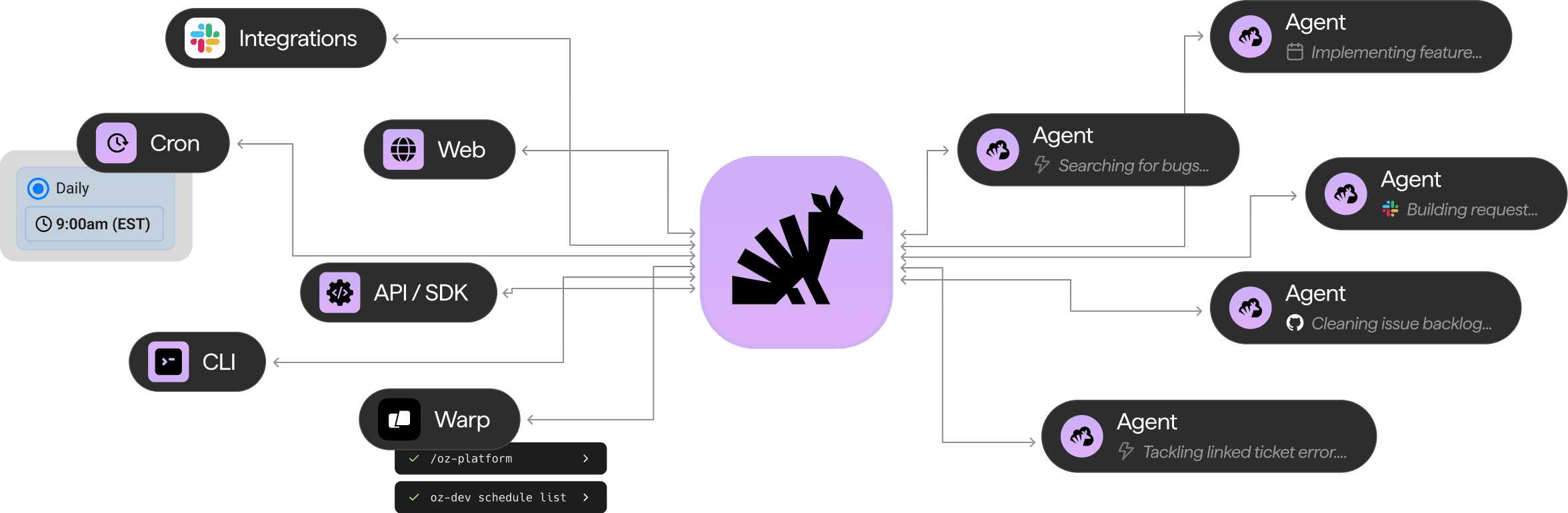 Oz is the orchestration platform for cloud agents. Spin up unlimited parallel cloud coding agents - programmable, auditable, and fully steerable.