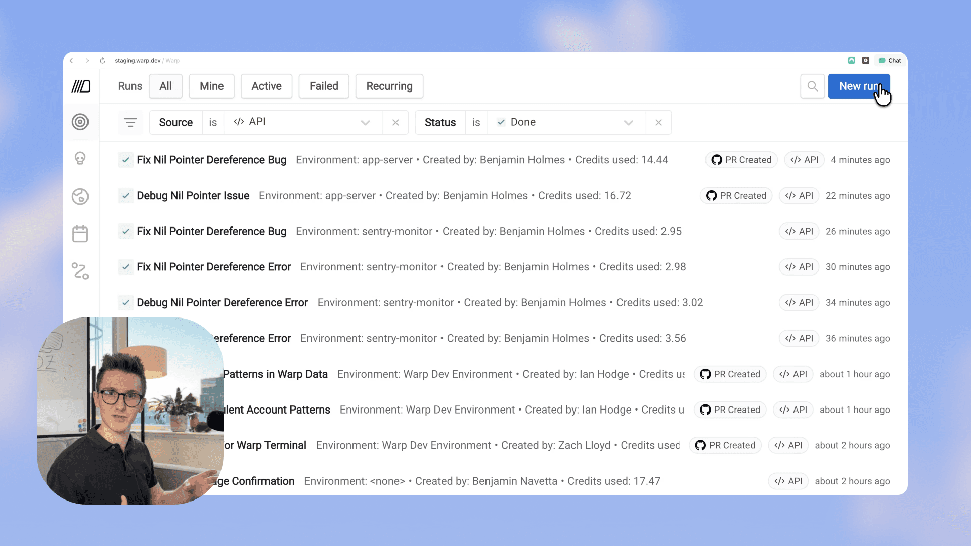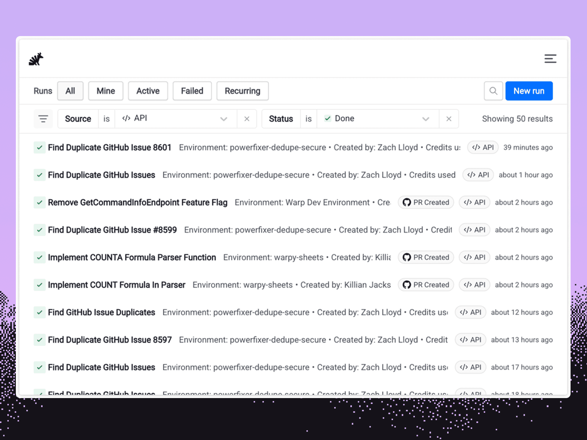 Launch an Oz agent right from our web app. Best for launching coding automations for tasks like PR review.