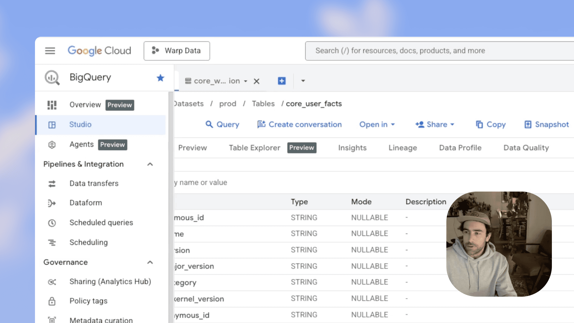 Watch Ian (Data Scientist at Warp) use Oz to monitor customer data using BigQuery to send a scheduled insight summary to his team on Slack