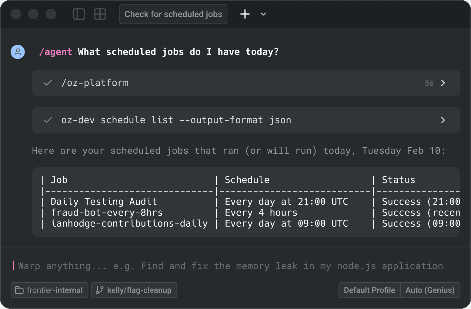 Schedule agents to run like cron jobs and report back how youd like. Oz agents are based on Skills.
