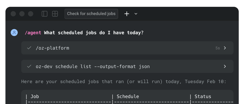 Use natural language to talk to your terminal. Oz can run interactive commands, work in subshells, and even run in the cloud.