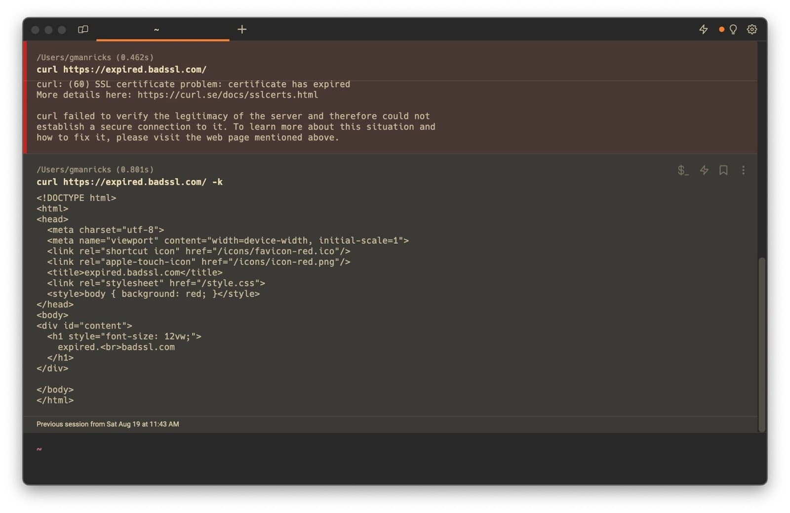 If you are using Warp, you can get to this request using the AI Command Search by typing # and then curl ignore ssl