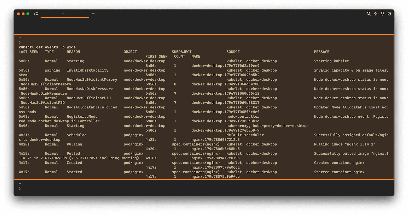 If you’re using Warp as your terminal, you can easily retrieve this syntax using the Warp AI feature:Entering kubectl get events in the AI question input will prompt a human-readable step by step guide including code snippets.
