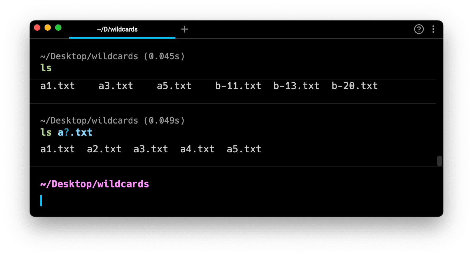 A question mark requires a character (a.txt is not matched): ls a?.txt